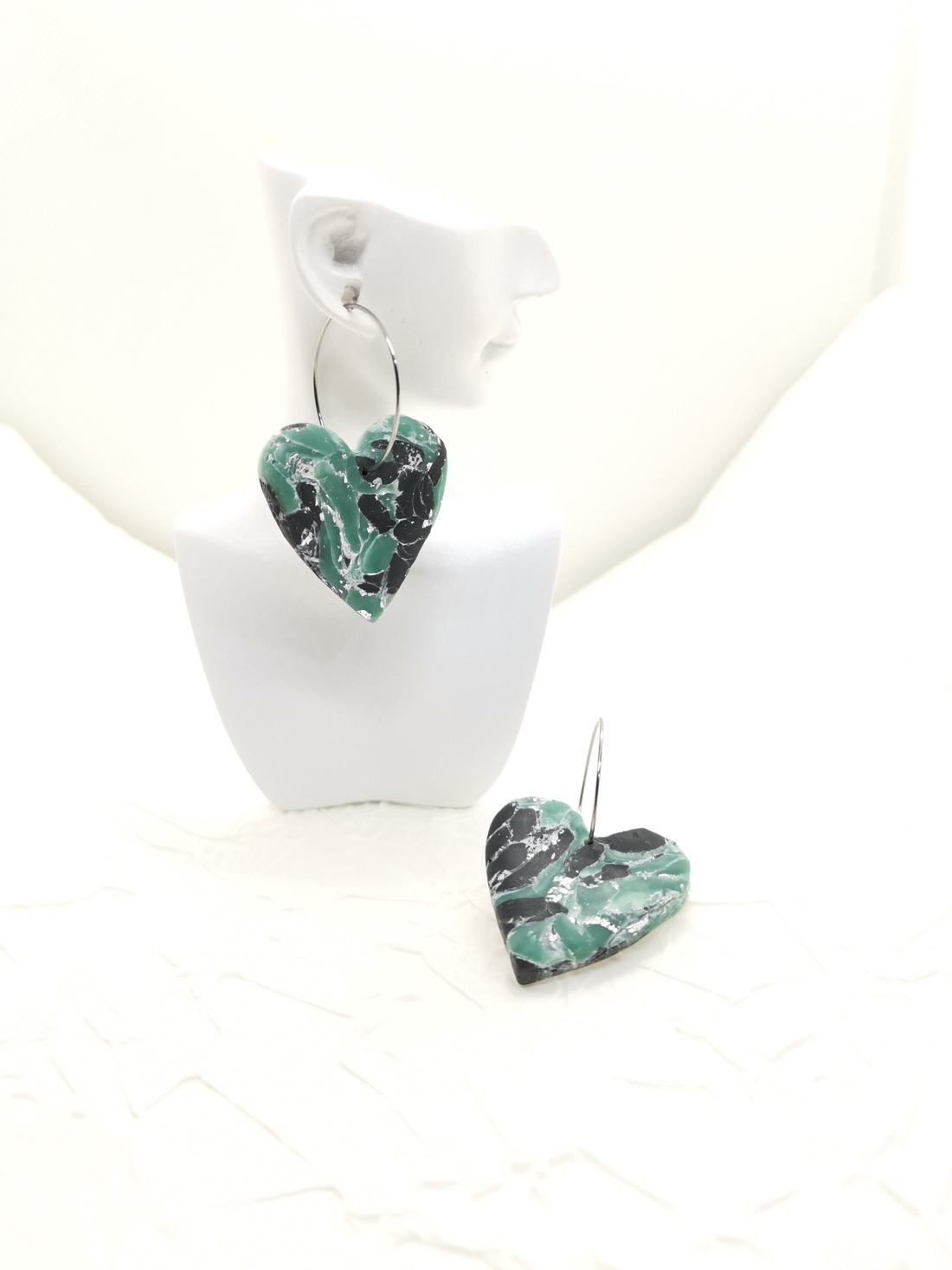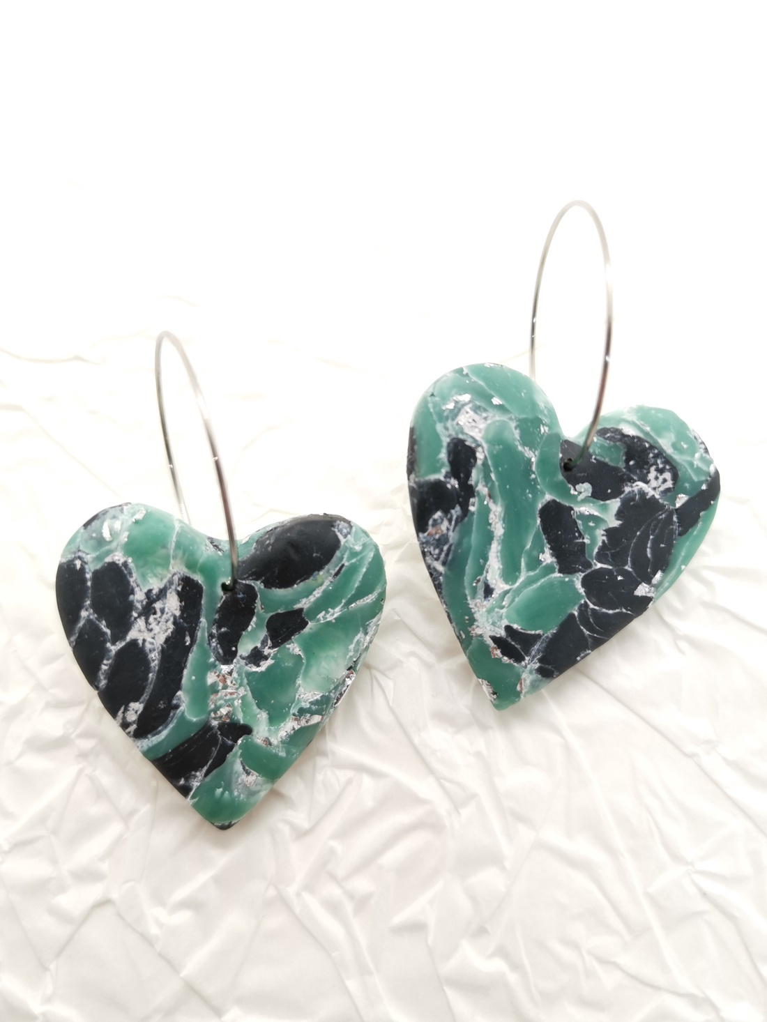 Cercei inimă Furtuna de Smarald - Cercei statement inimi verzi smarald din lut polimeric și inox